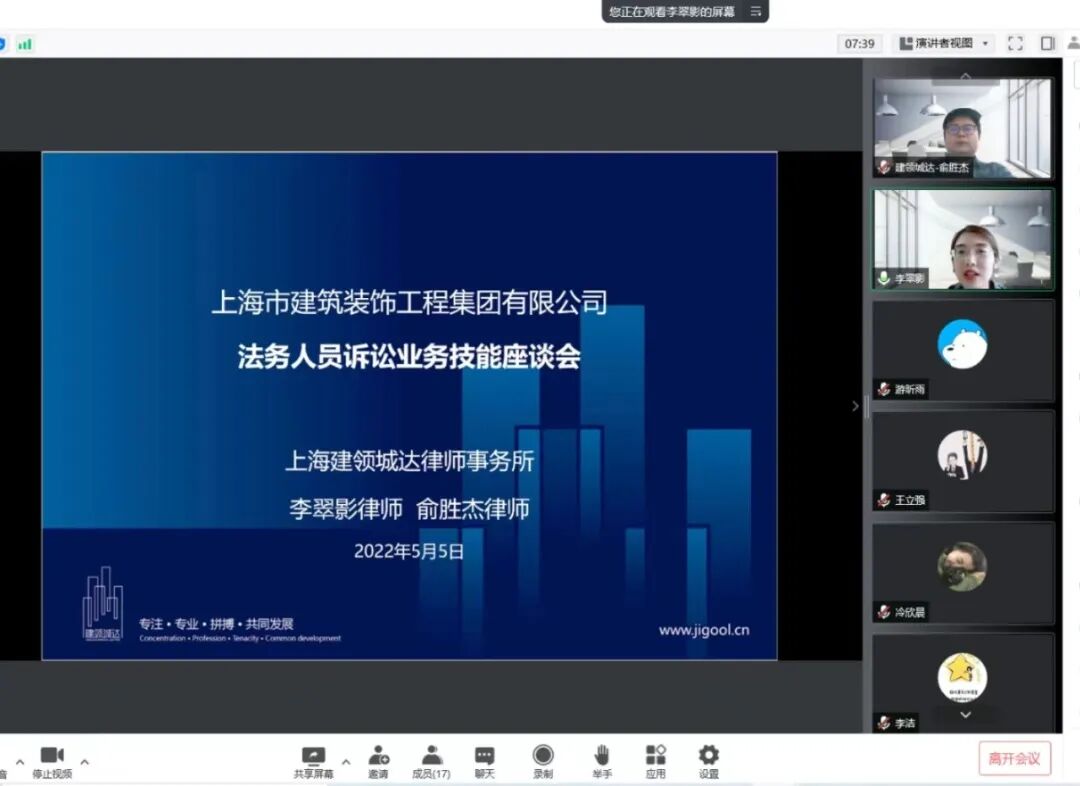 (以下简称“上海建工装饰集团”)法务人员加强交流合作、共同提升诉讼业务技能,为客户提供更有针对性的法律服务,2022年5月5日下午,应邀为上海建工装饰集团法务人员