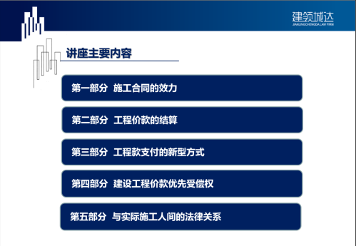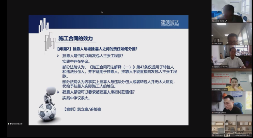 本次培训聚焦建设工程项目合同履行过程中的常见风险及应对方法,共分为五个部分进行解说。首先,王敏律师从《施工合同司法解释(一)》的规定入手,列举了施工合同无效的具体情形,并对实践中常见的挂靠、转包及未取得规划许可证导致合同无效等重点问题进行了深入解析;其次,针对工程价款的结算,就无效合同情形下合同价款的结算;招投标导致合同无效,无效合同中的管理费;背靠背结算条款、逾期结算视为认可条款的效力等建设工程施工合同纠纷中的常见问题进行了重点探讨。再次,就实践中工程款支付的新型方式,王敏律师着重对于实践中容易引起争议的商业汇票、保理、以资抵债三种方式中包含的风险和防范方式进行了逐一探讨。此外,针对建设工程价款优先受偿权,就优先受偿权与抵押权的顺位、起算时间、行使方式、范围等结合真实案例进行了深入浅出的讲解。最后,针对实践中屡见不鲜的实际施工人相关案件,王敏律师从厘清实际施工人的认定出发,重点对承包人对实际施工人的责任承担、案件中的表见代理的风险进行了全方位分析并提出了应对之策。